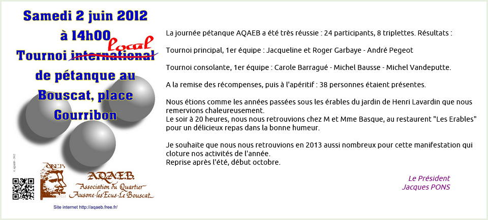 Galerie Photo Divers « retour à l’albumTournoi de pétanque au Bouscat, samedi 2 juin 2012. Screenshot 2025-07-09 at 20-52-29 AQAEB - Le BouscatImg001Img002Img003Img004Img005Img006Img007Img008Img009Img010Img011Img012Img013Img014Img015Img016Img017Img018Img019Img020Img021Img022Img023Img024Img025Img026